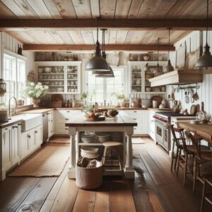 - Descripción: El estilo Farmhouse, o estilo de granja, se inspira en la vida rural y los hogares de campo tradicionales. Se caracteriza por su calidez, rusticidad y encanto rústico. Utiliza materiales naturales como madera y piedra, muebles robustos y accesorios vintage para crear un ambiente acogedor y familiar.
